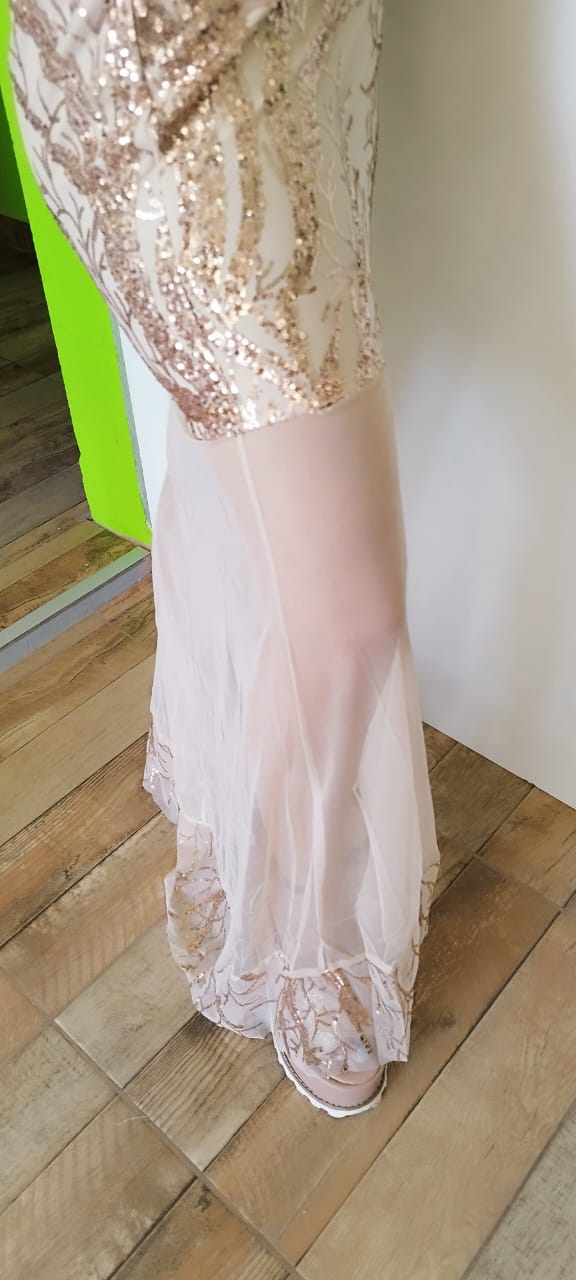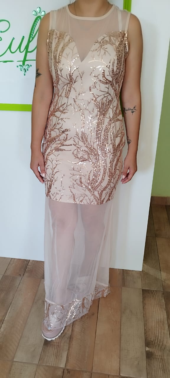 VESTIDO DE FIESTA CORTO, CON FALDA EN TUL. ESCOTE EN V PROFUNDO BORDADO CON LENTEJUELAS. COLORES NEGRO Y DORADO.