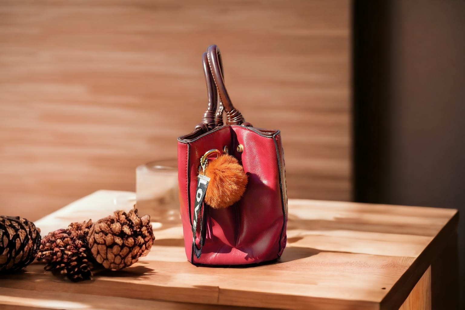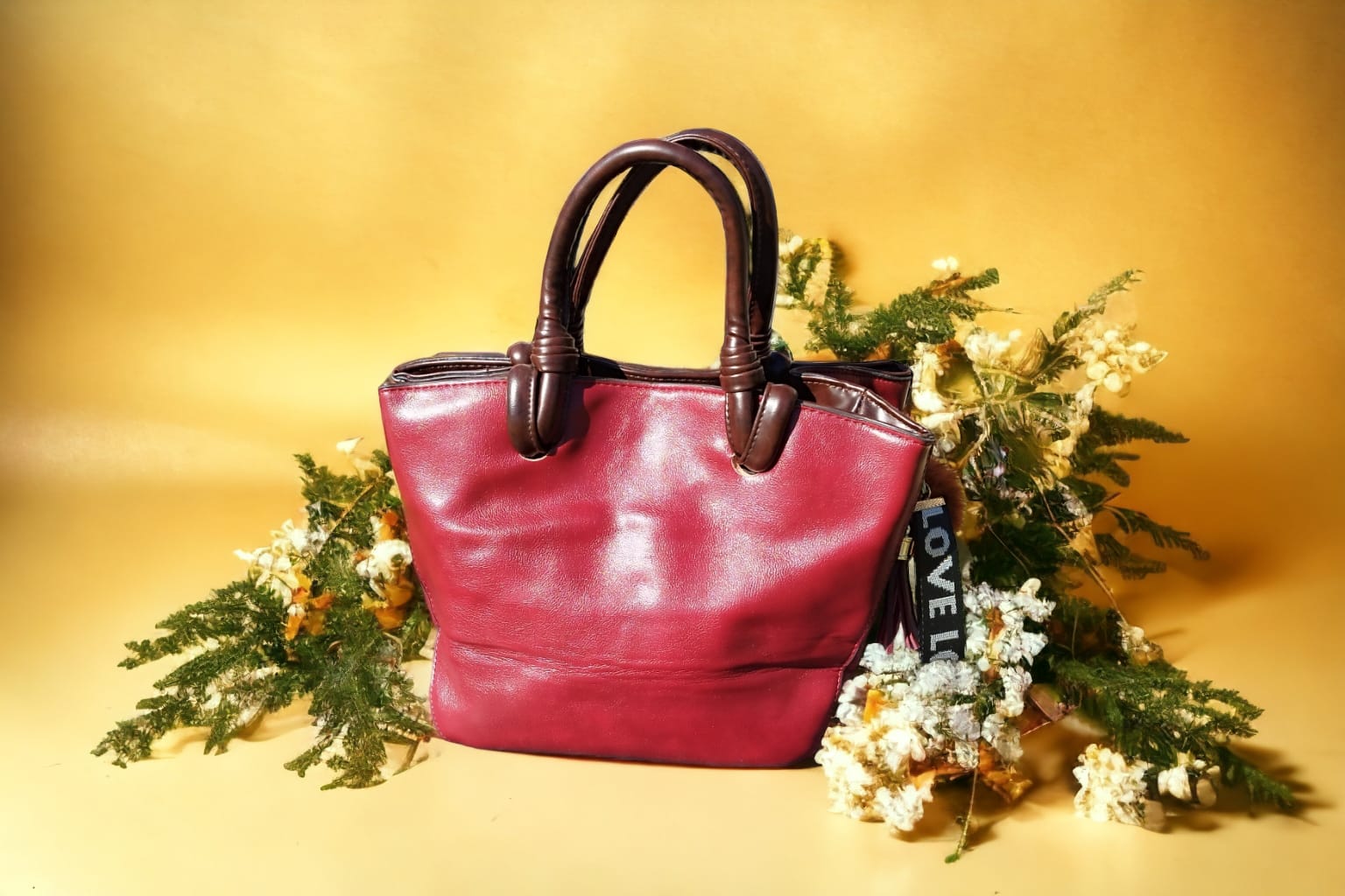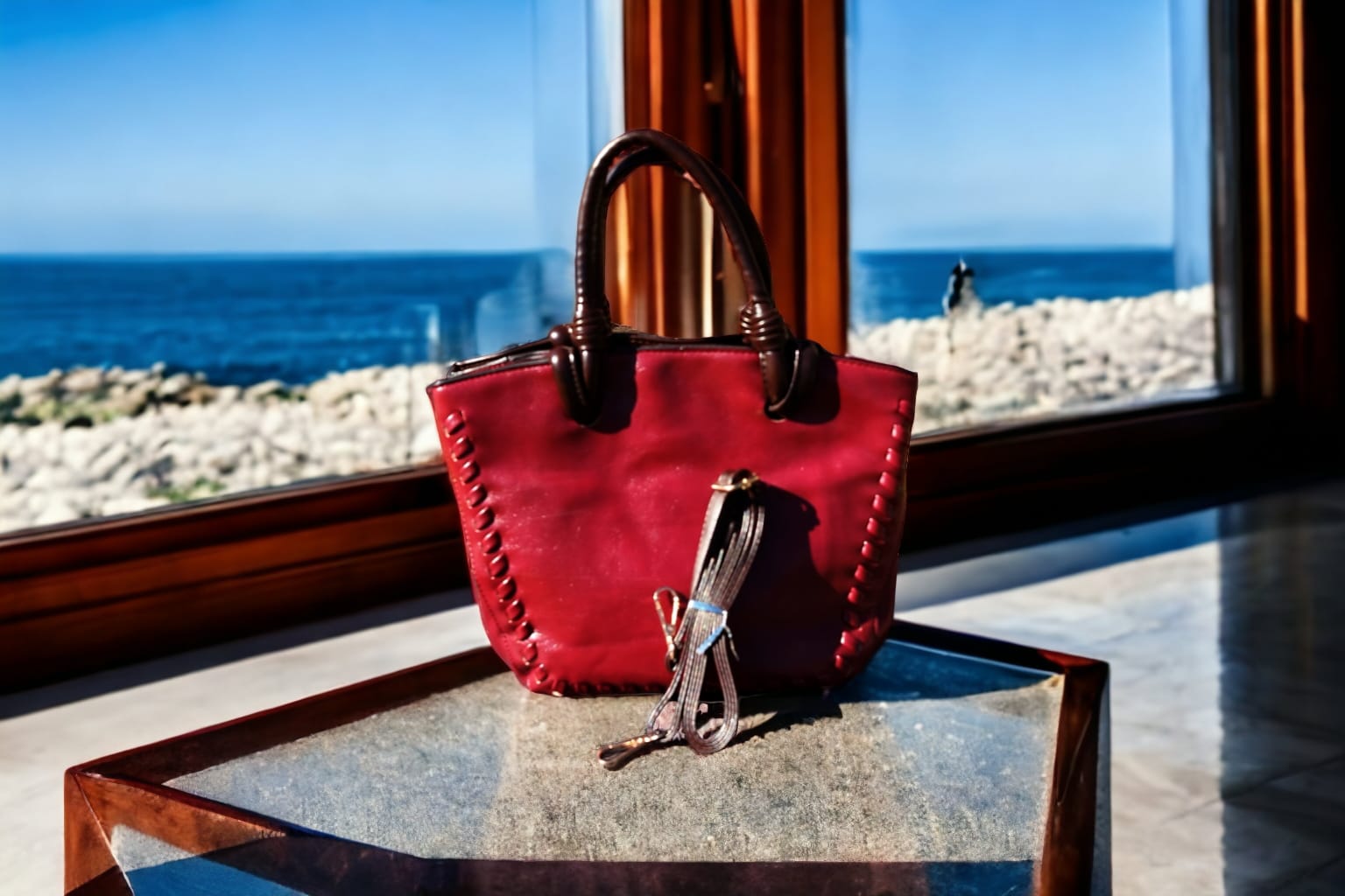Elegante cartera bordo de cuero, interior forrado, bolsillo interior con tres cierres. Cartera de hombro o cartera de mano.