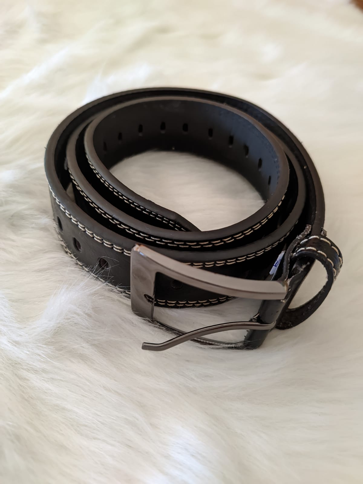 Cinturón de vestir de hombre de colores varios con diseño grabado, lisos y perforados. Doble costura. Hebilla puntera plateada, negra y gris .Confeccionado con cuero reconstruido 100%. Va de los talles 95 cm a 115 cm. Marca: varias.