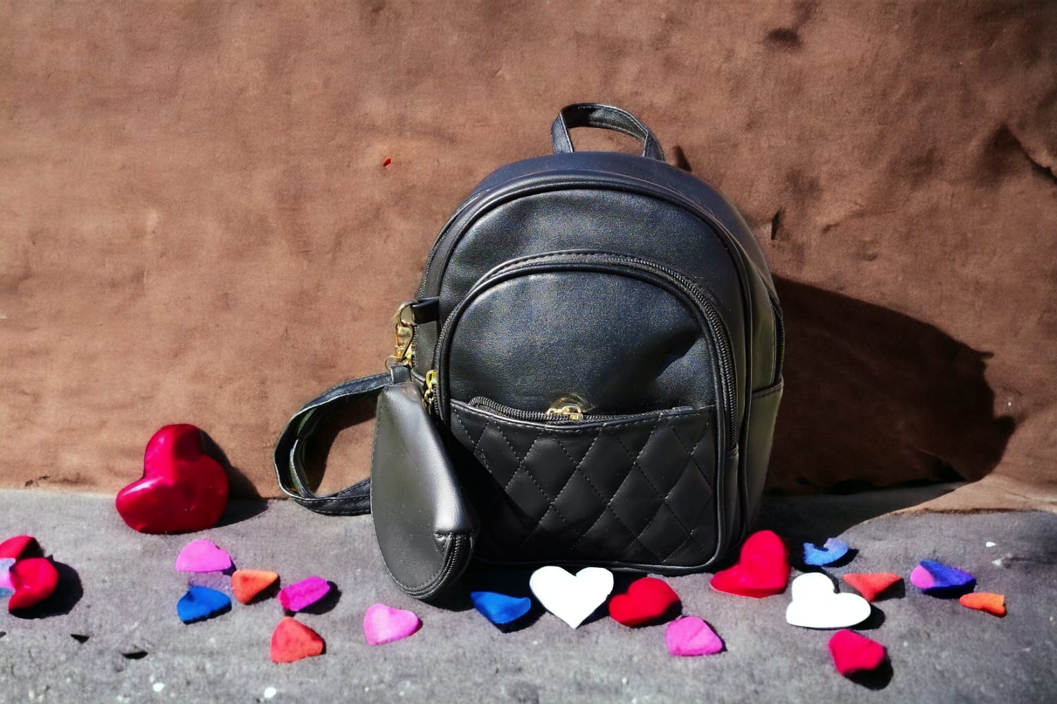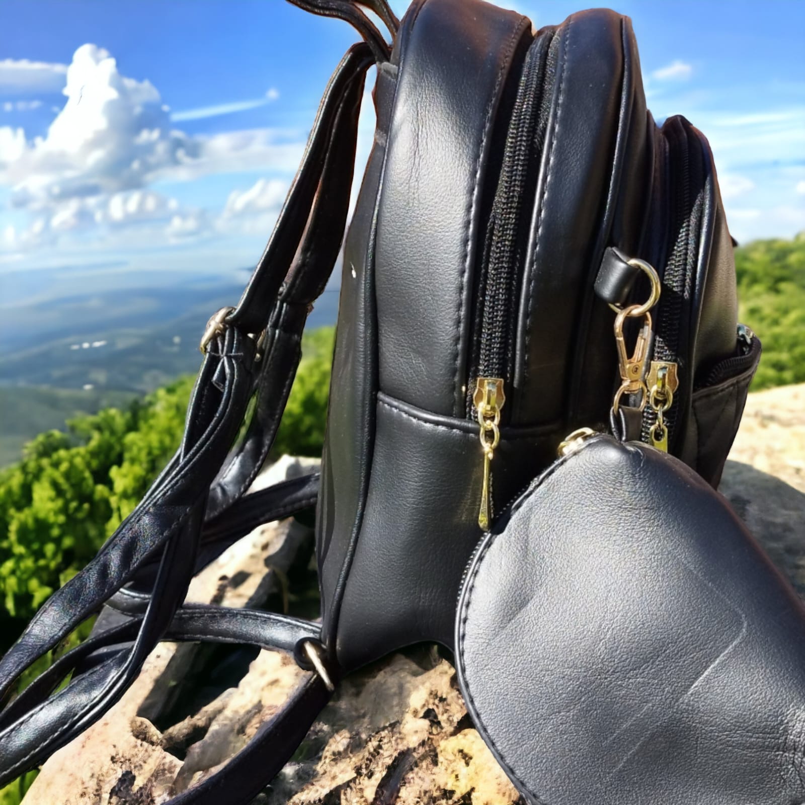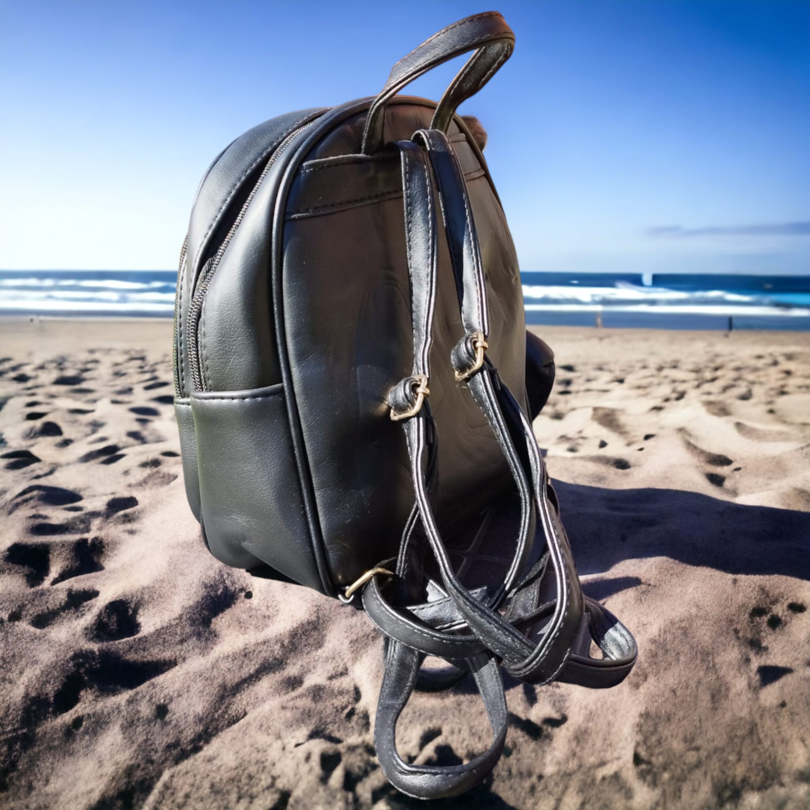 Mochila eco cuero, pequeña en color negro excelente calidad. Triple compartimiento, en su interior forrado también tiene uno. Las correas se adaptan a la medida del usuario, su medida es ideal para salir a pasear con algo cómodo y no tan grande, y ademas viene con un pequeño monedero.
