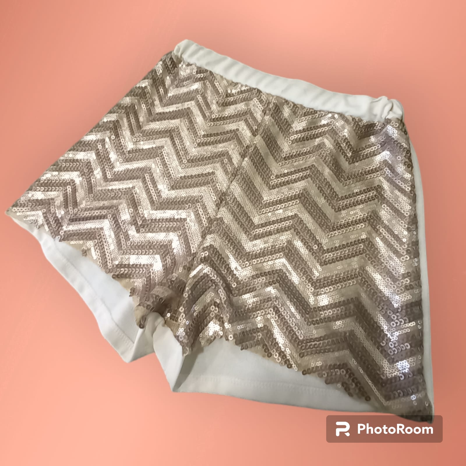 Short blanco en la parte de atrás y en la parte de adelante es de lentejuelas doradas, cintura elastizada. Cualquier ocasión es perfecta.