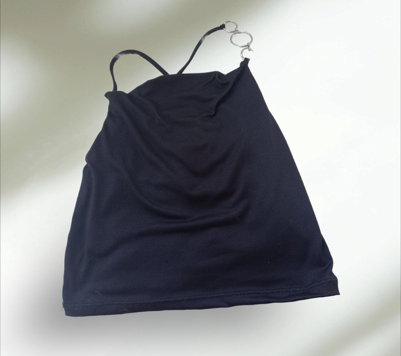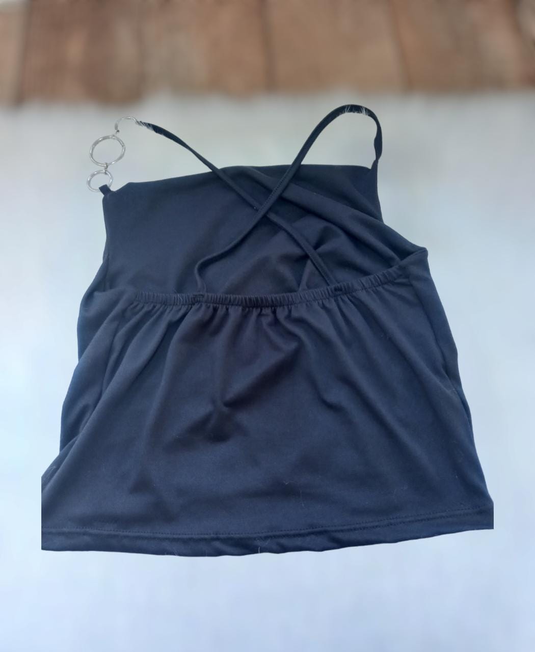 Top negro con argollitas en el hombro y en la espalda tiritas cruzadas, talle único.