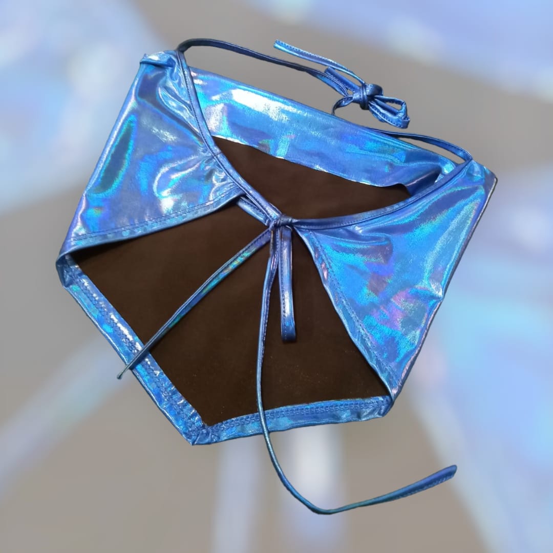 Top azul con tiras para atar en el cuello y espalda, talle único.