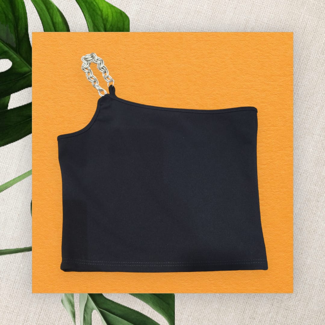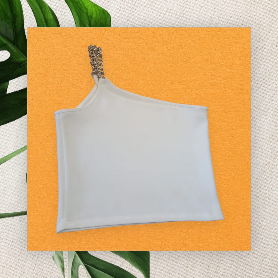 Top en color blanco y negro con detalle en el hombro de cadenas plateadas, talle único.