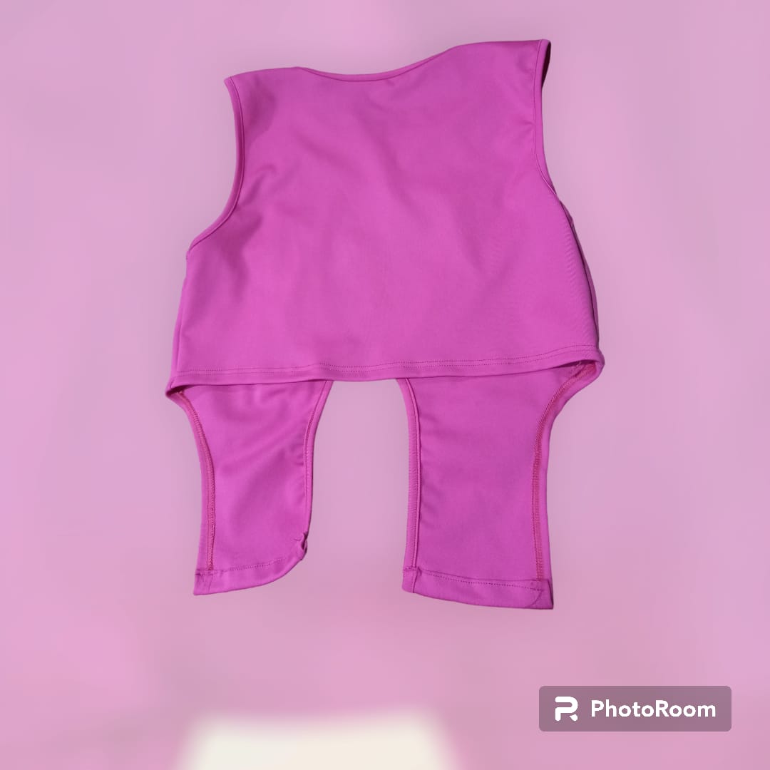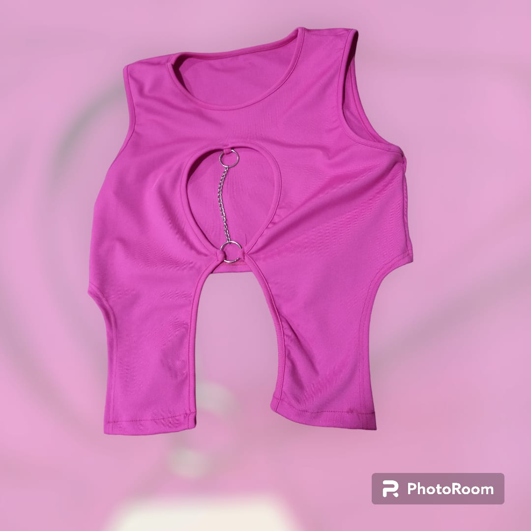 Top fucsia con cadenas plateadas, talle único.