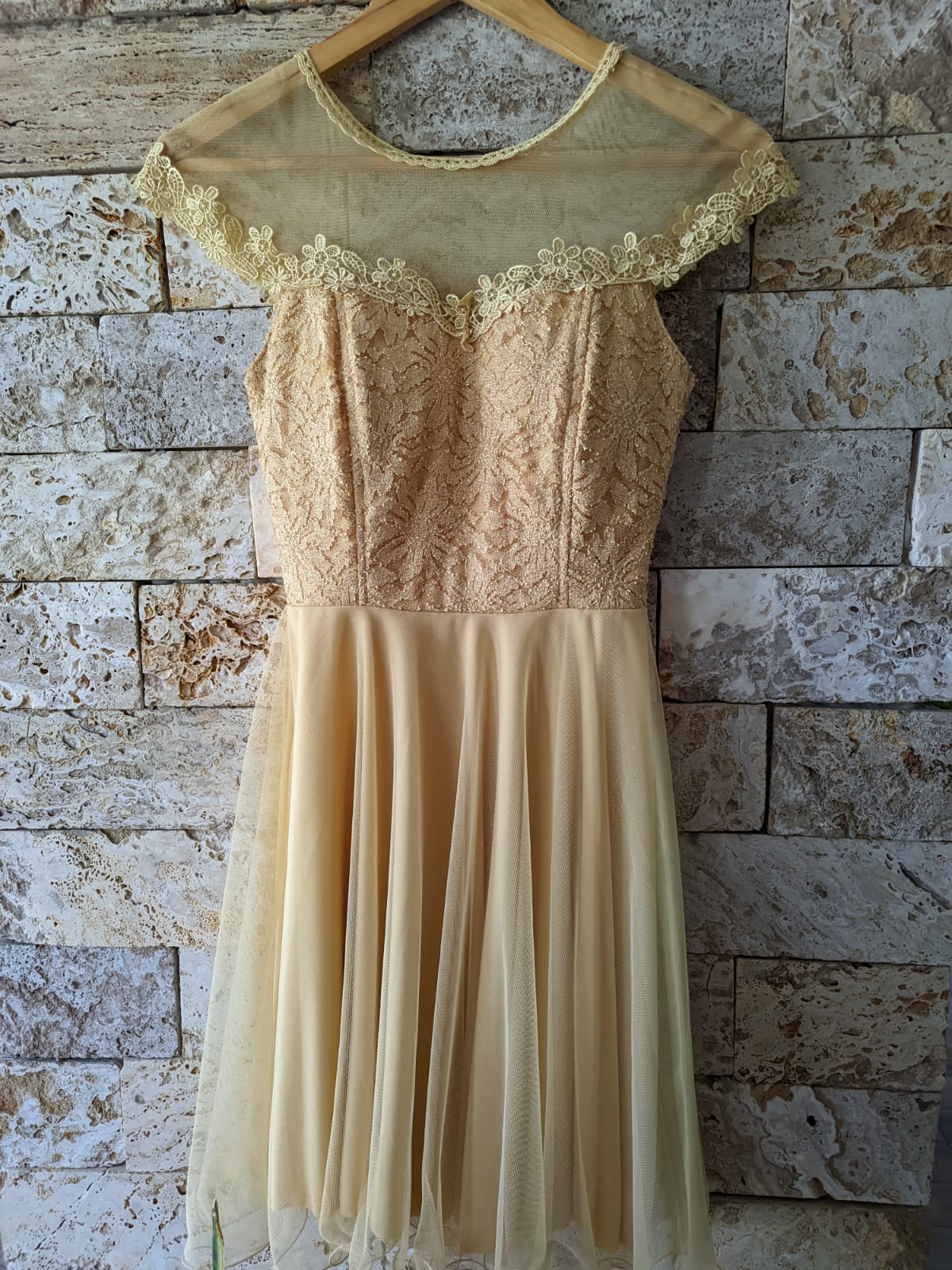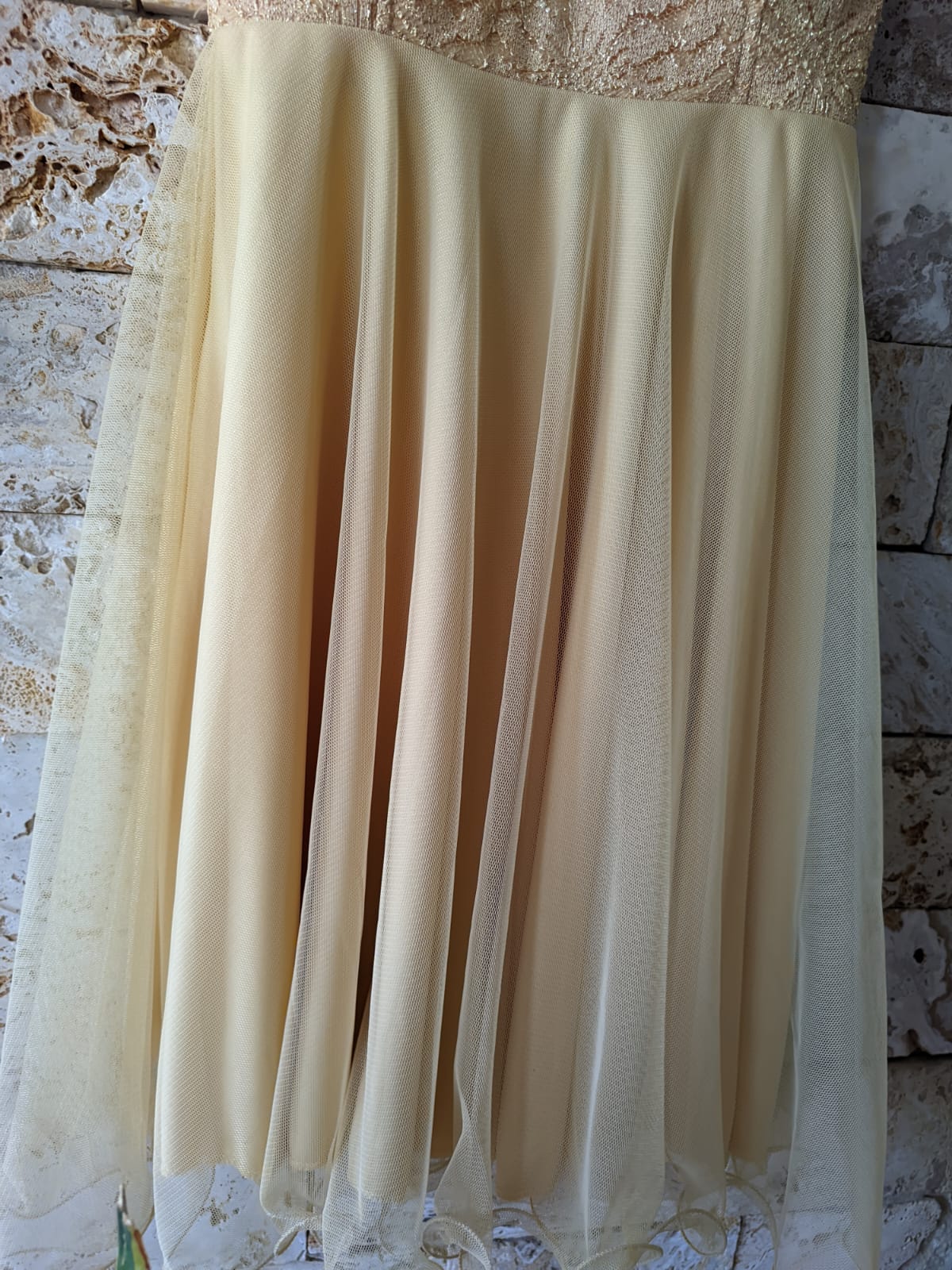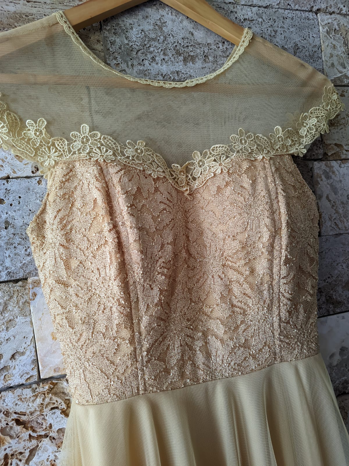 Vestido dorado de 15, con tul, encaje y contiene tasas. Talle único.