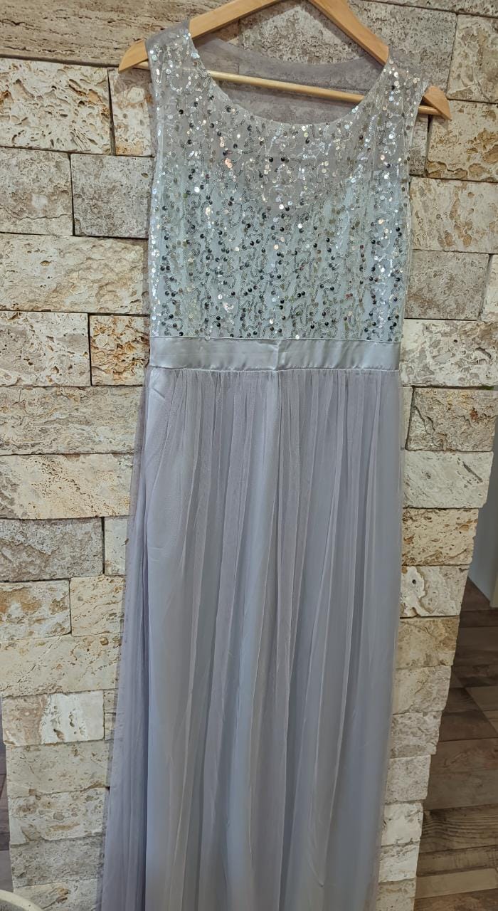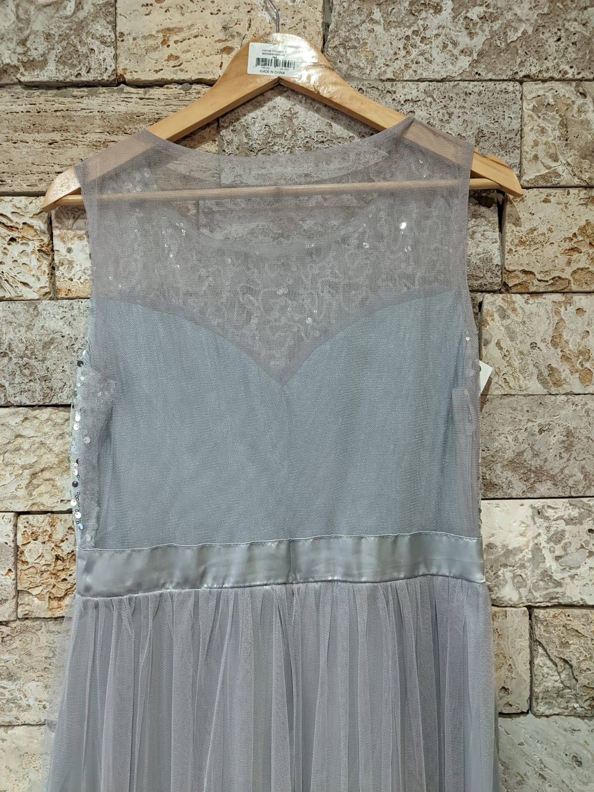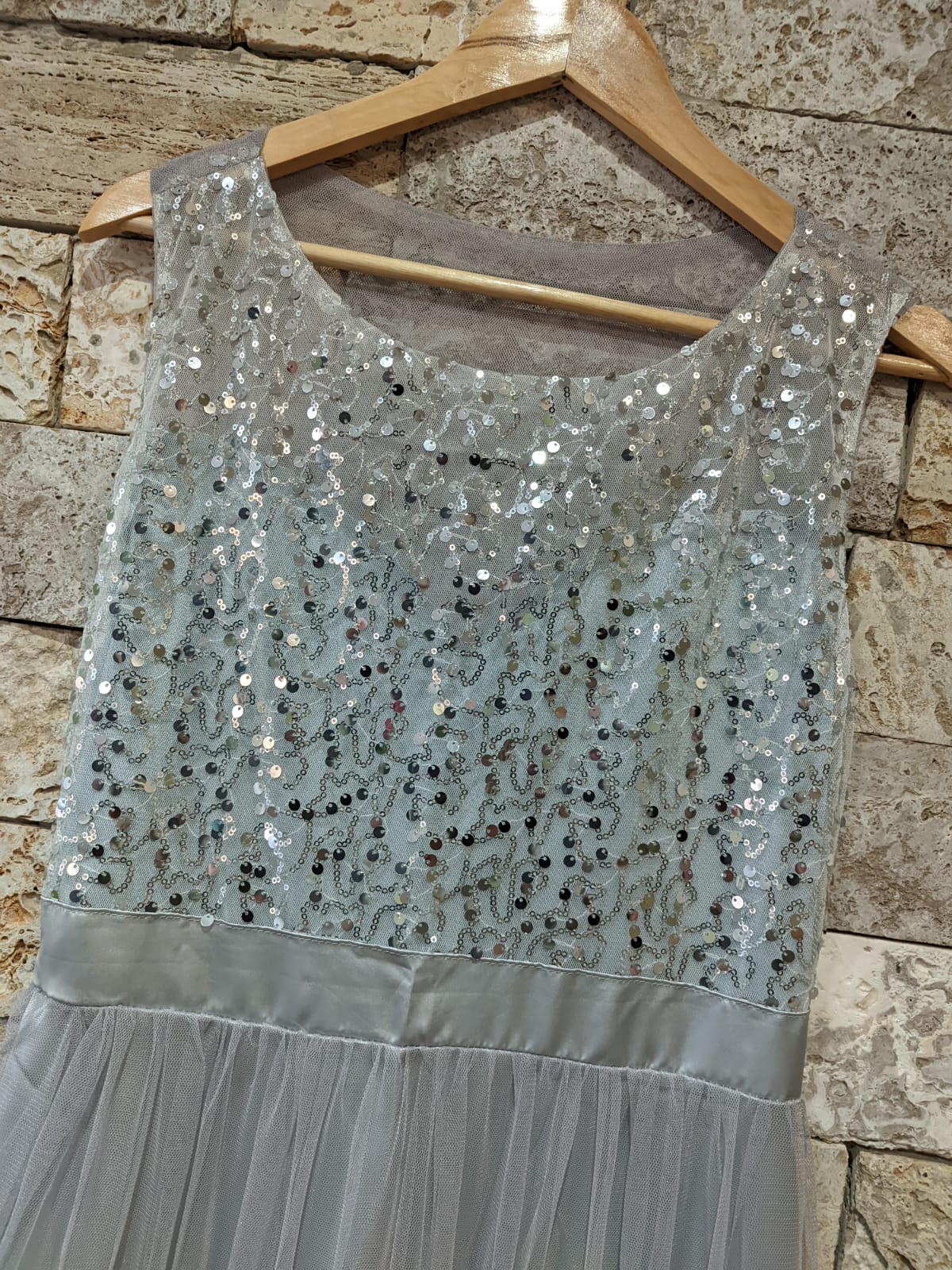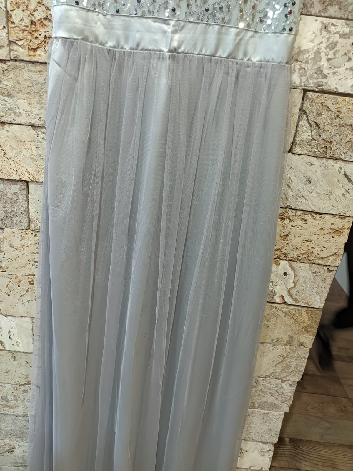 Vestido gris de tela satén y tul con lentejuelas, talle L.