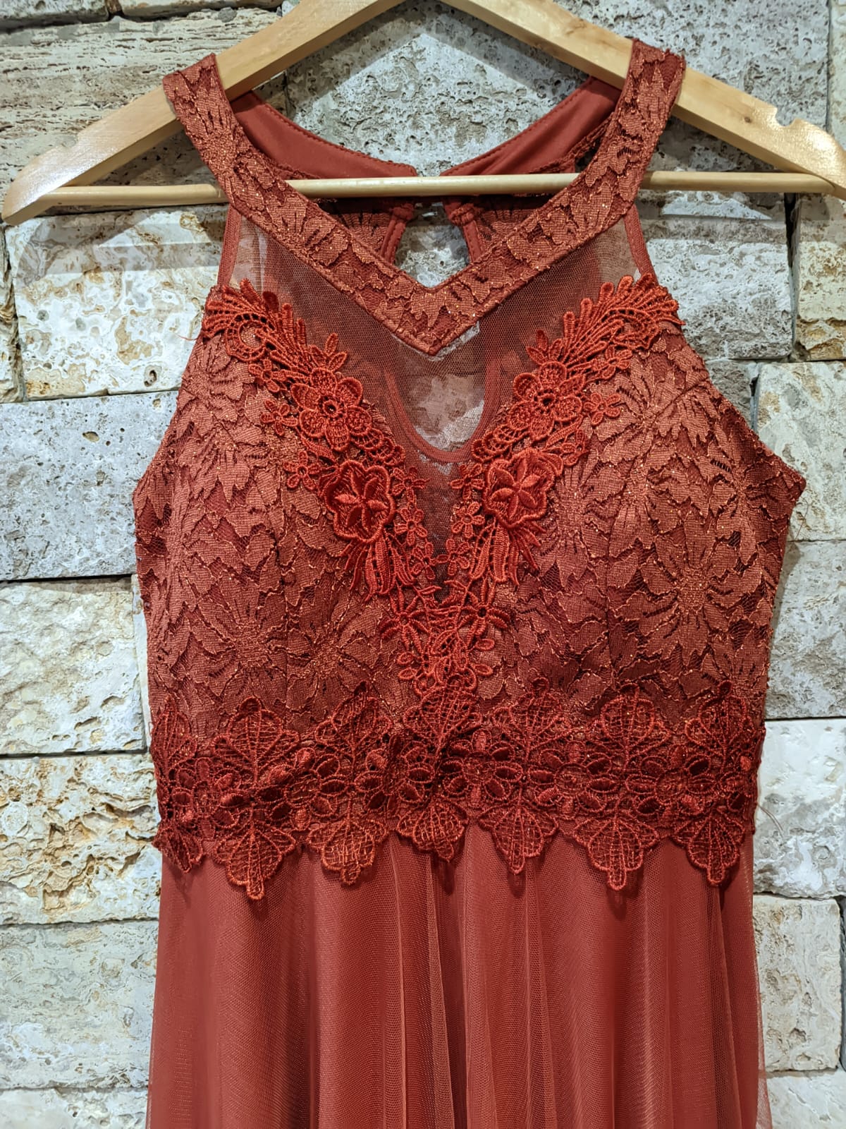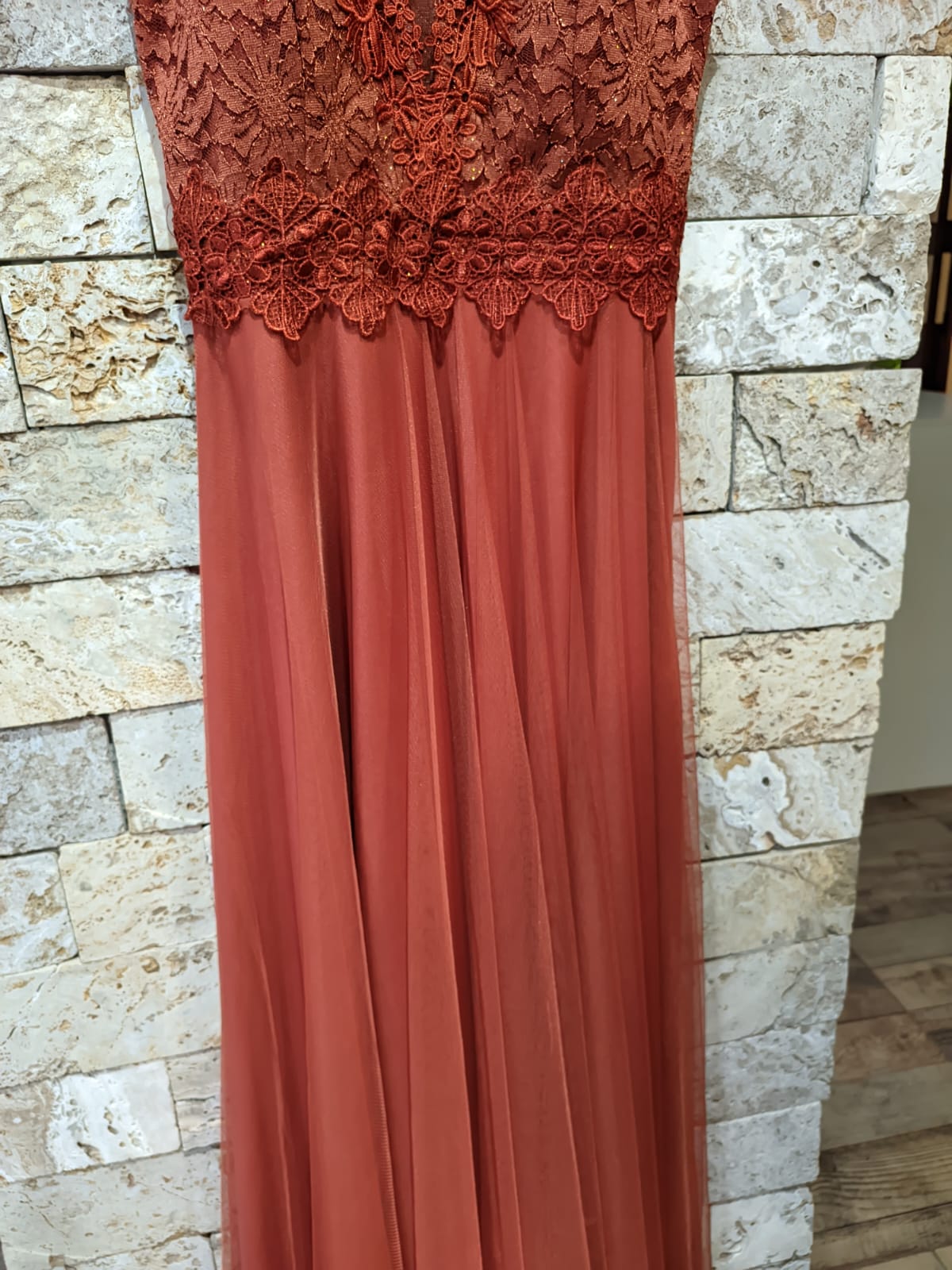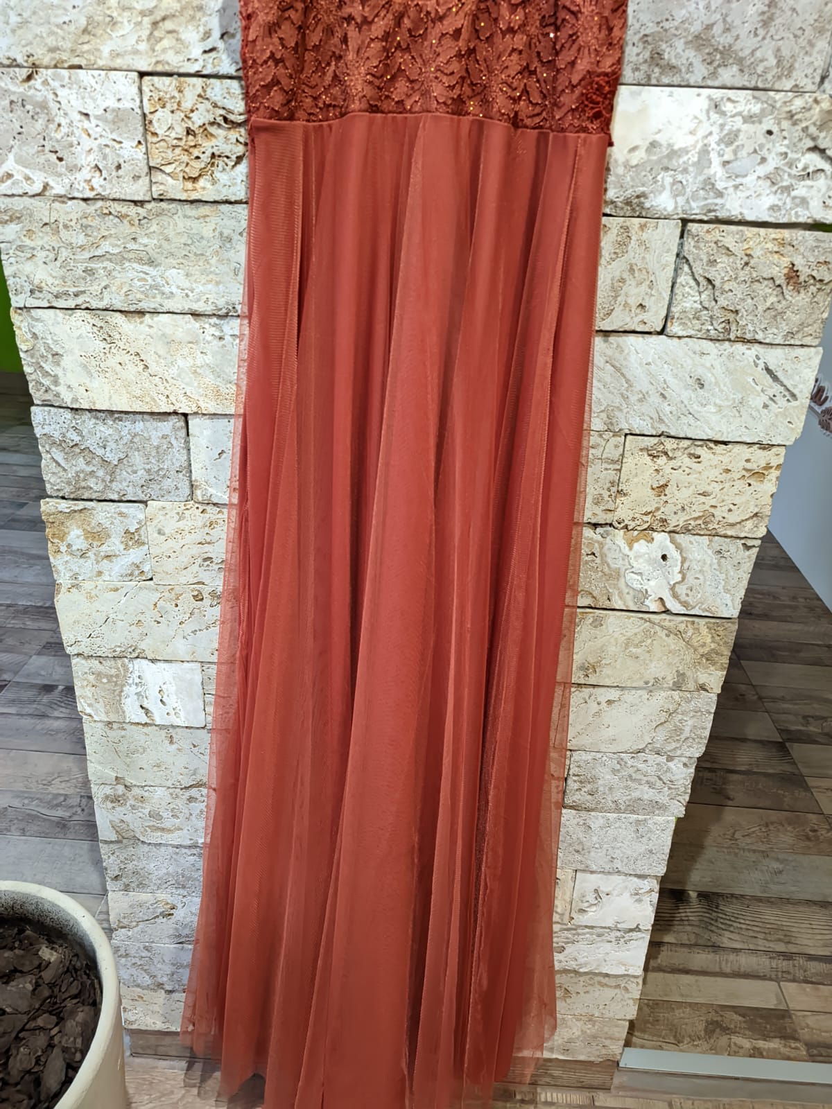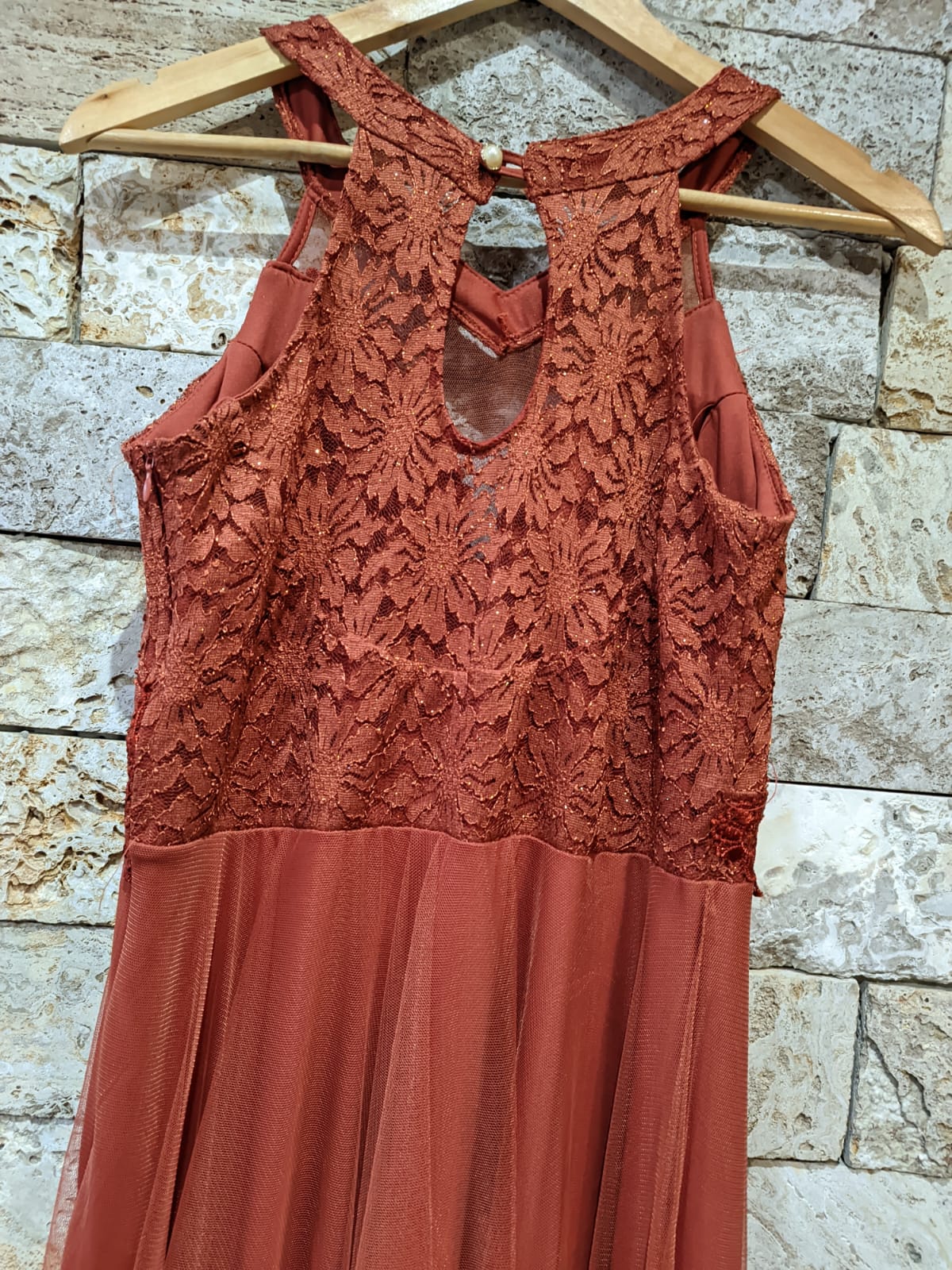Vestido color marrón clarito de tela satén y tul, y hermoso detalle de encaje. Talle M.