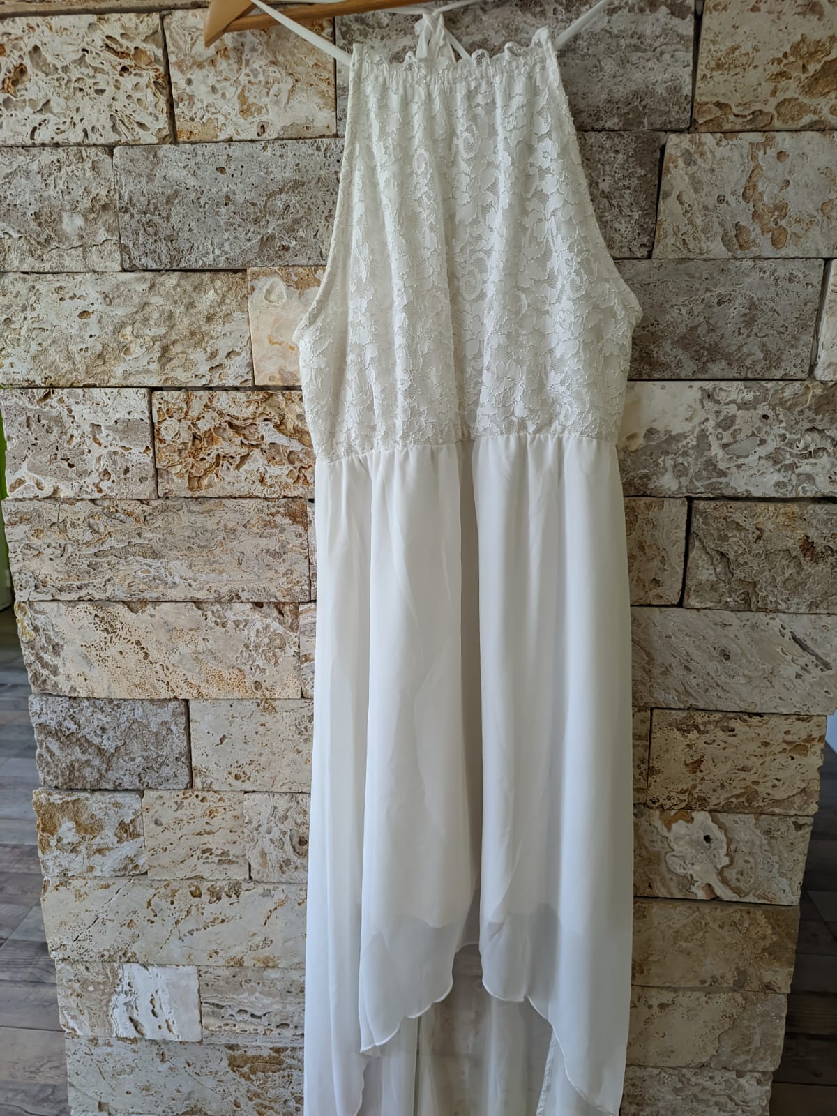 Vestido blanco con encaje corto adelante y largo detrás, cintura elastizada. Talle 1.