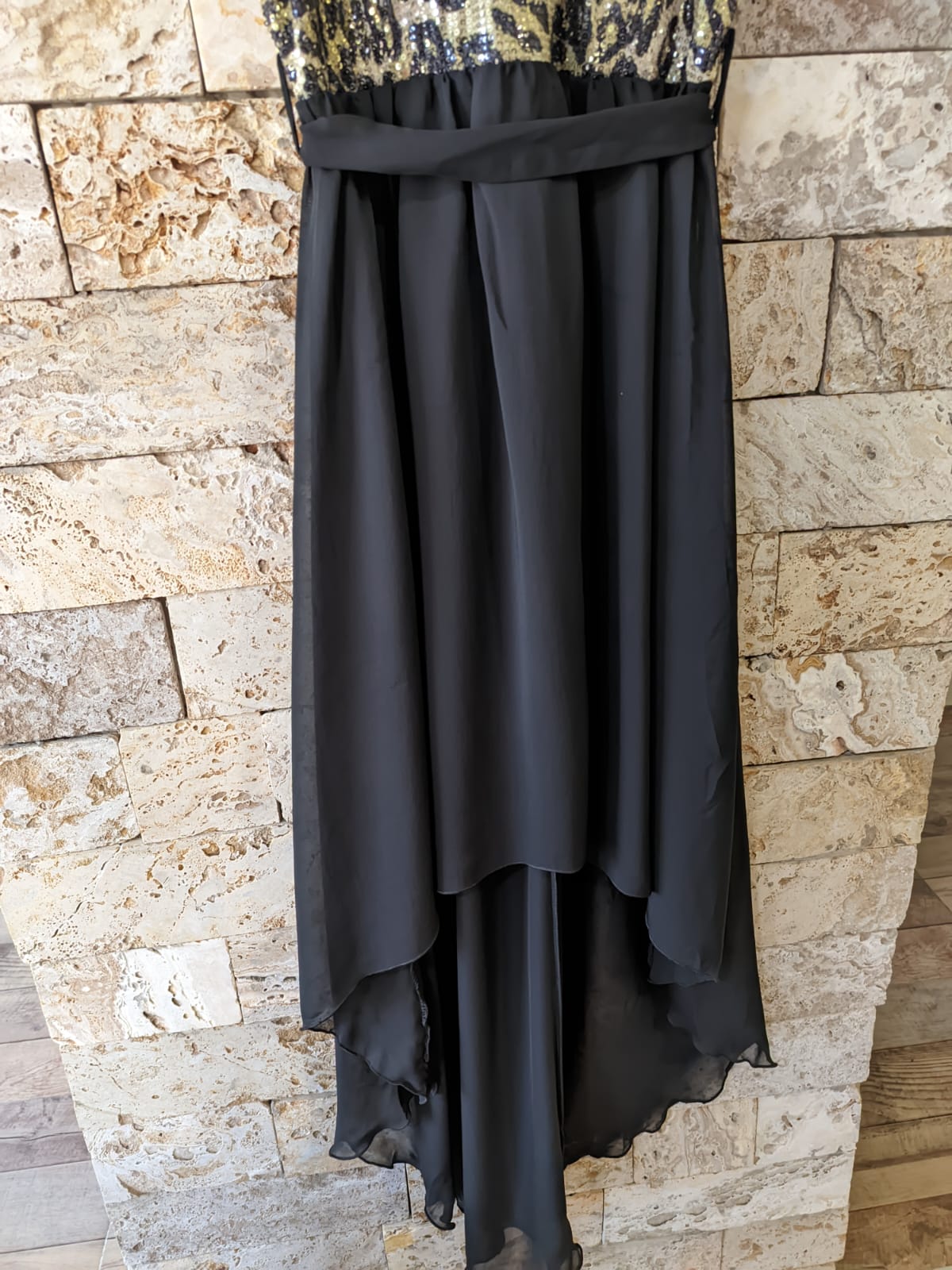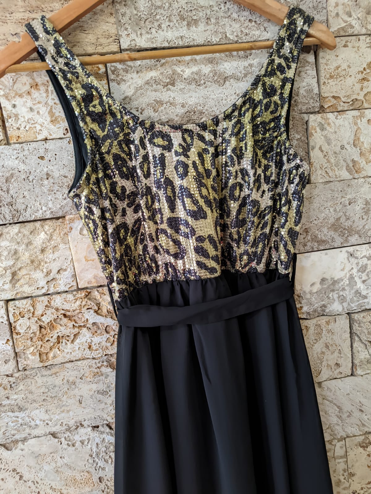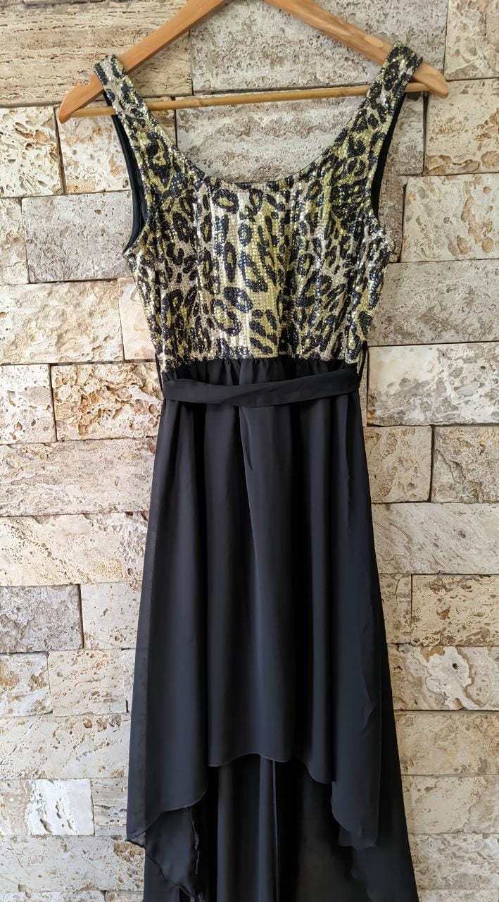 Vestido de animal print con lentejuelas, corto adelante y largo atrás, talle 2.
