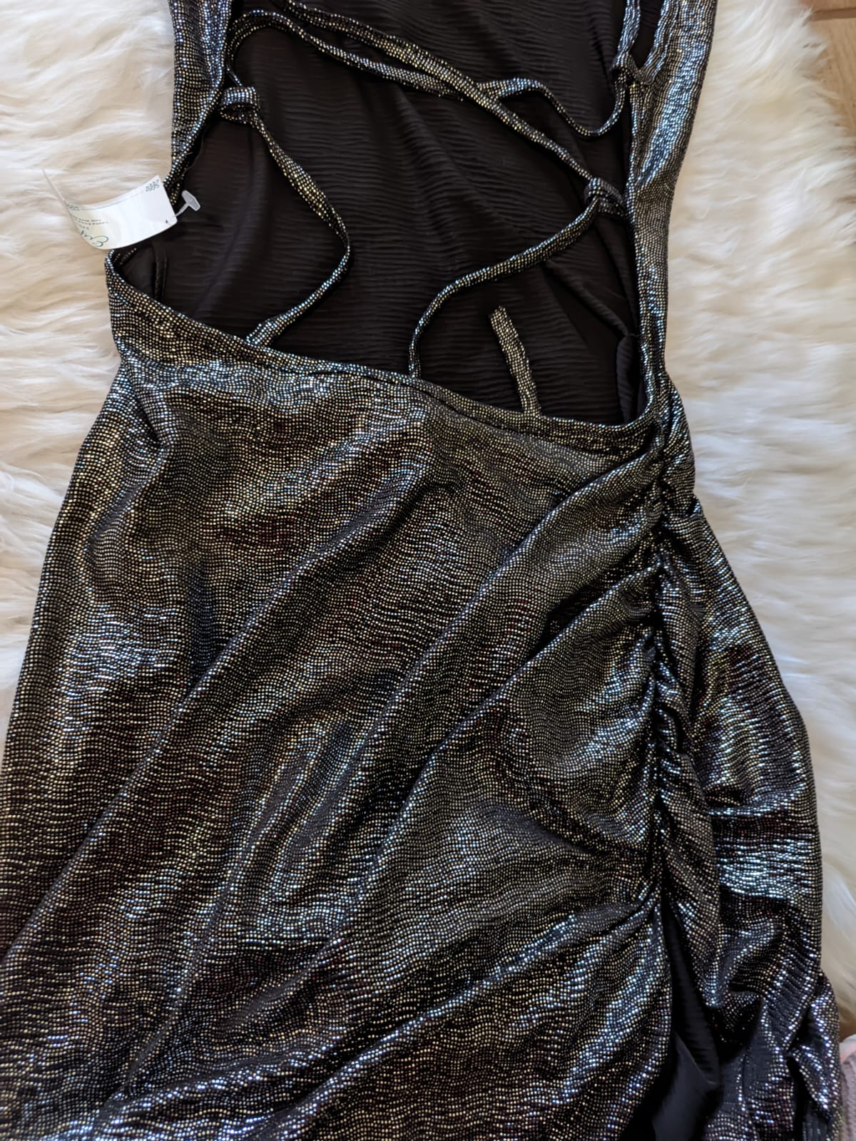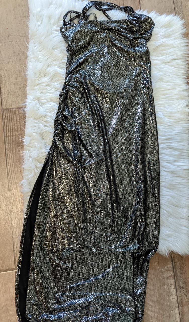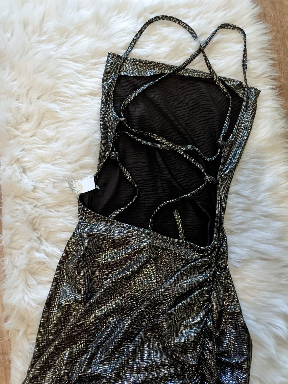 Vestido plateado con espalda descubierta con tiritas, talle único.