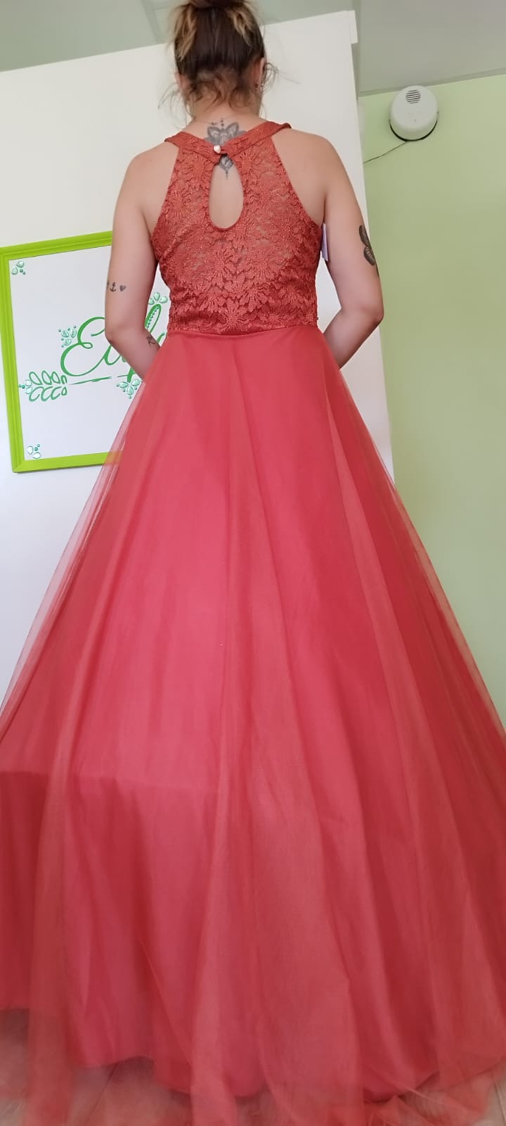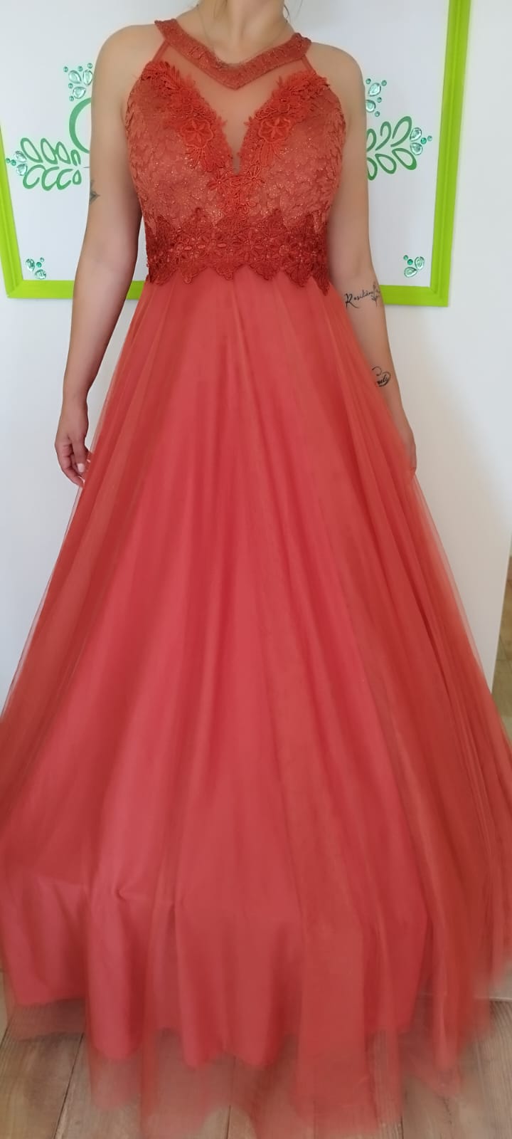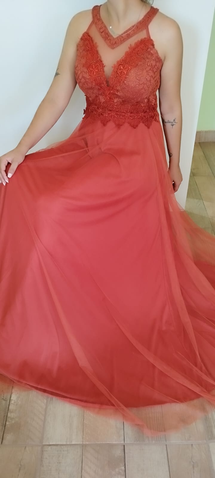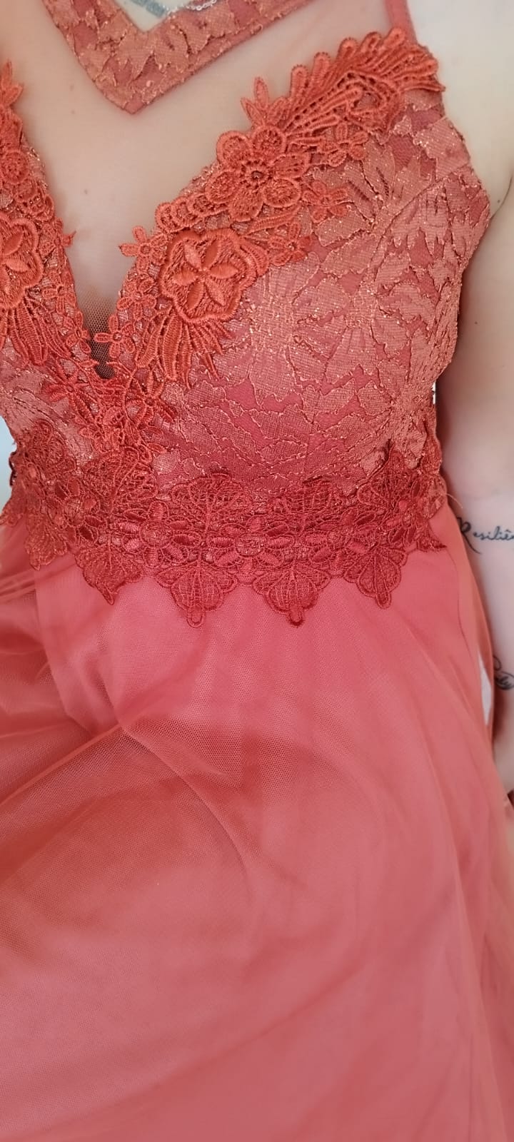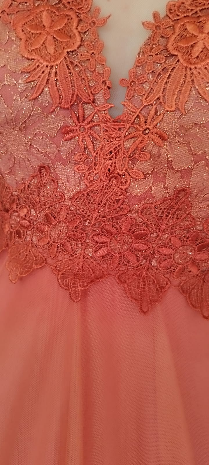Vestido al cuerpo ajustado con escote de corazón, que presenta un tul con semi transparencias y toques en guipur, terminando en una maravillosa falda estilo princesa en tul. Solo en color terracota